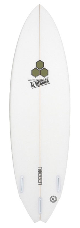 From the mind of Machado came the Robber in 2009, another addition to our fun short/wide boards that fly. Full and flat in front, thin and narrow in the tail. The tail is a winged swallow with spiral vee out the back. Originally designed to be ridden with the Twin Finner fins, this board also works great as a thruster. This design was originally ridden in the movie Sprout.